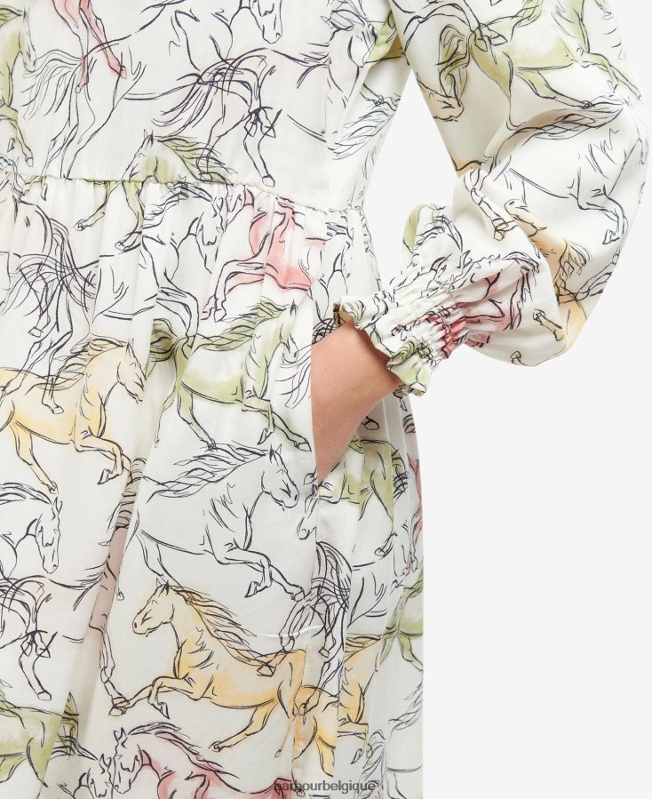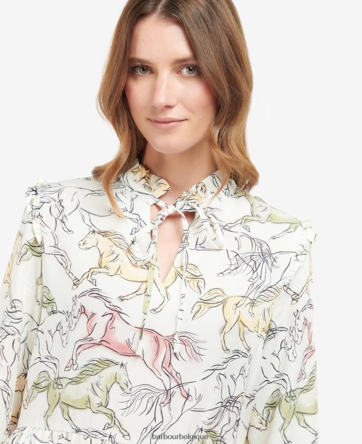 un incontournable astucieux de votre garde-robe, la robe barbour regia conçue dans un tissu doux et respirant et coulée avec un imprimé cheval coloré partout. orné de bordures à volants au col, aux épaules et aux poignets, ce style tendance s'accorde parfaitement avec des bottes et des sandales.